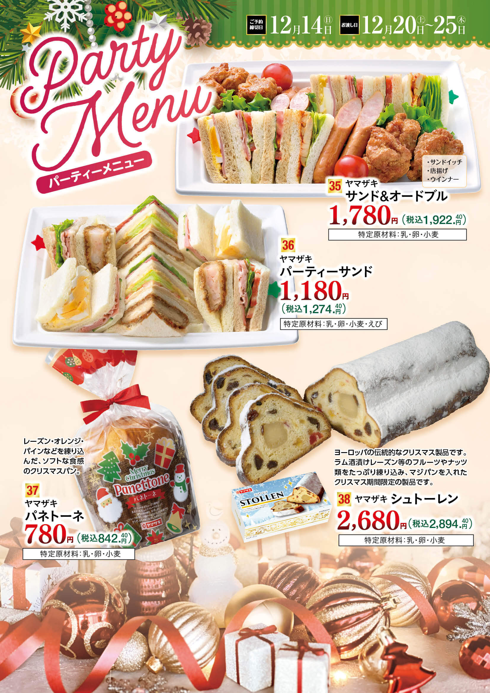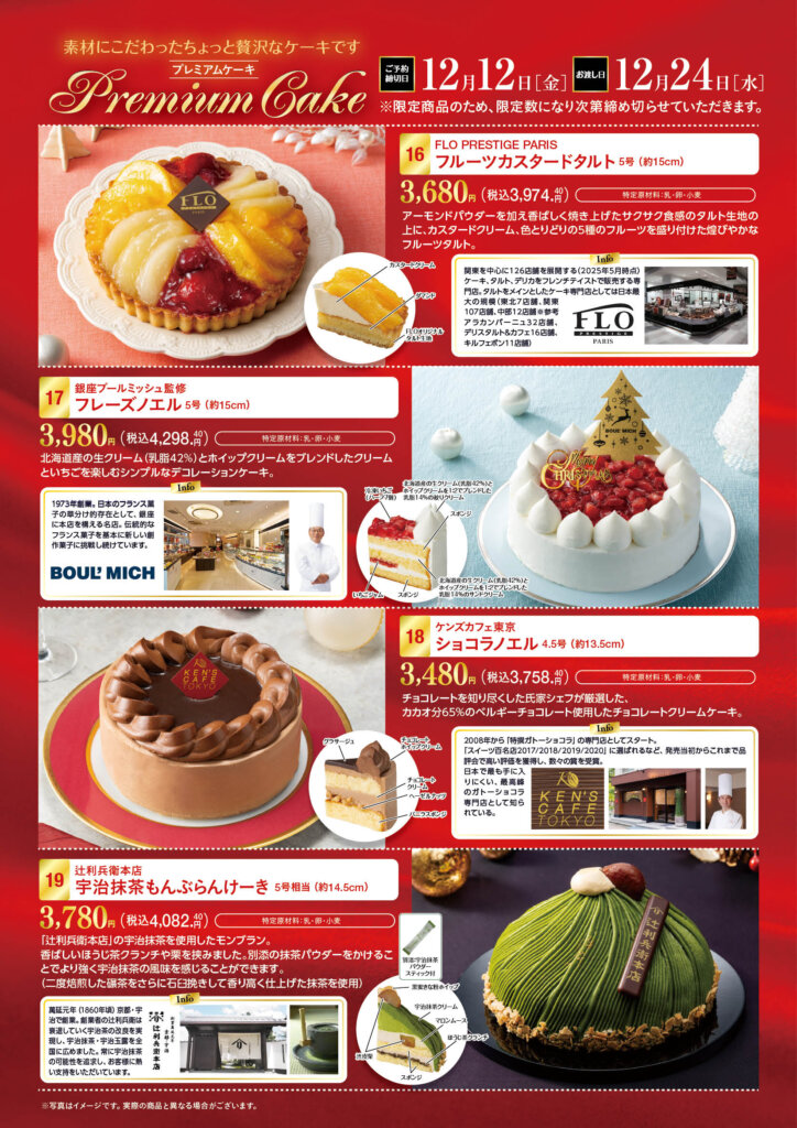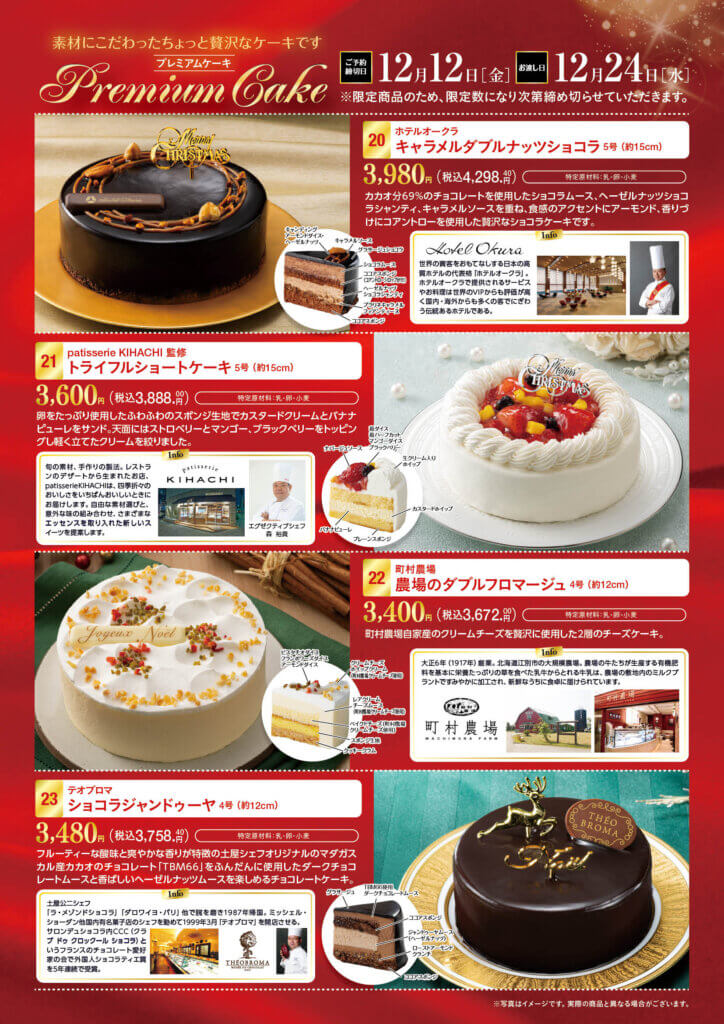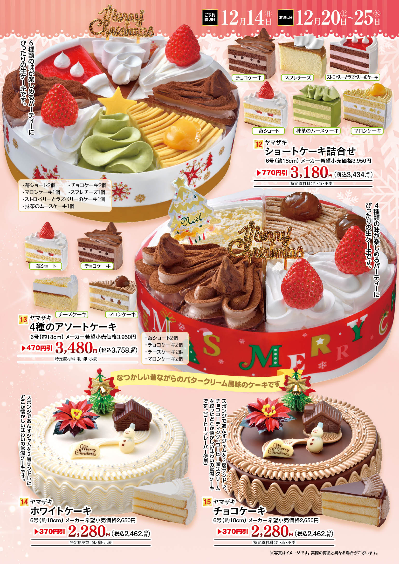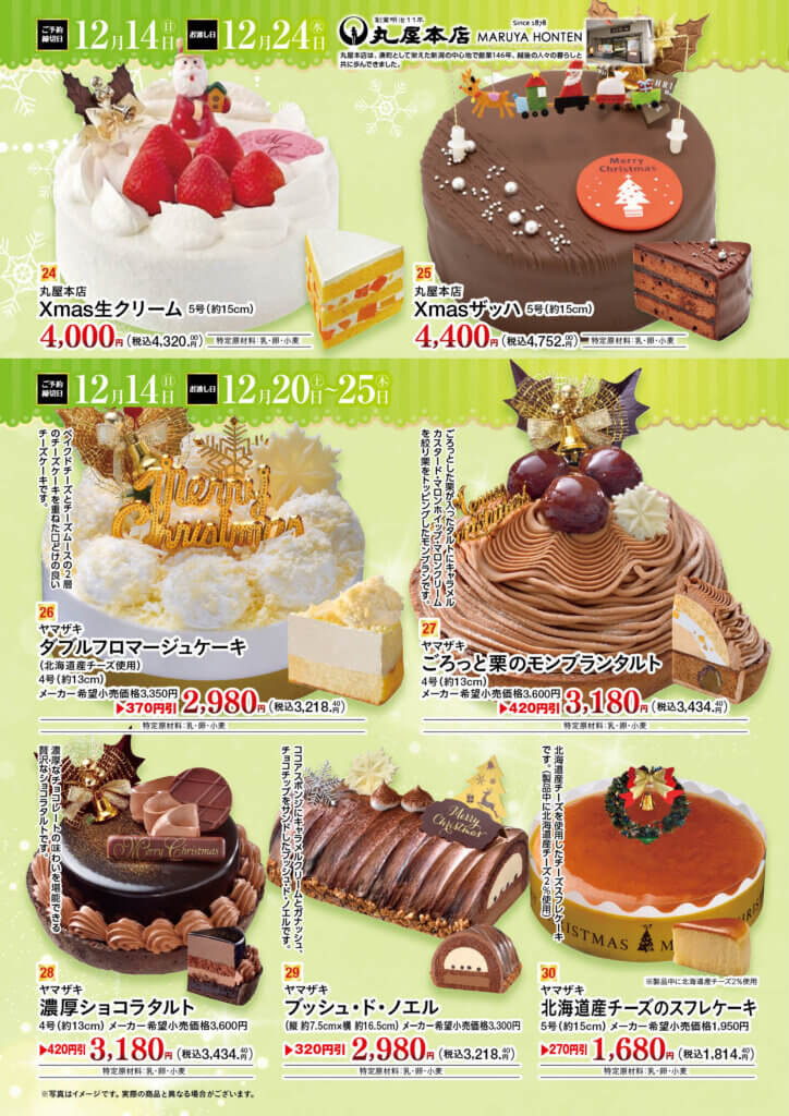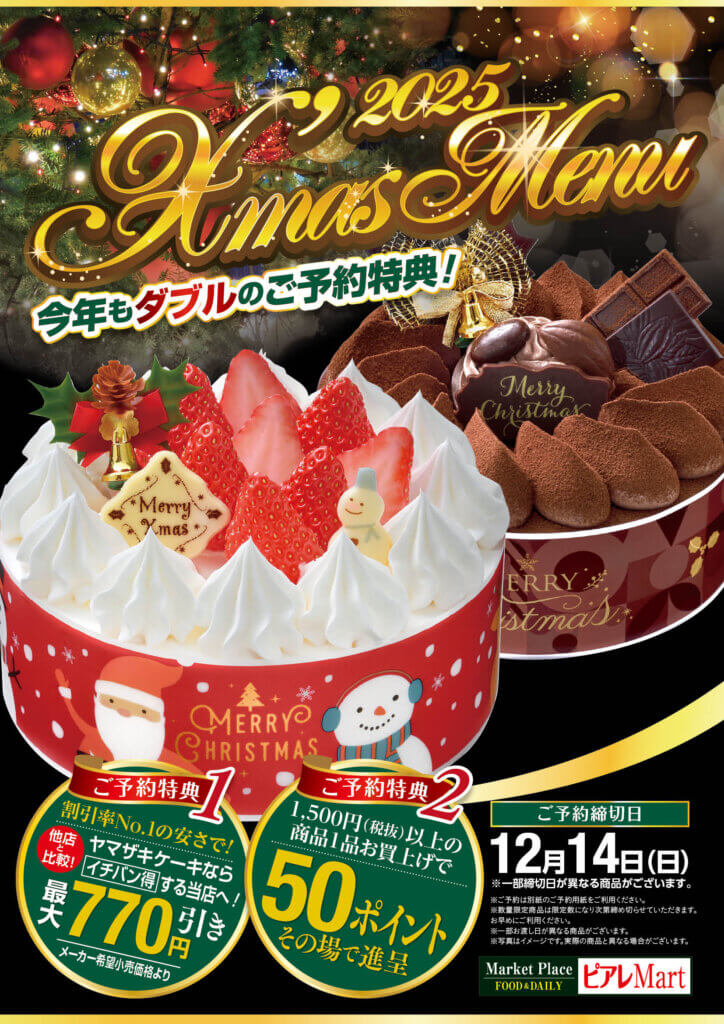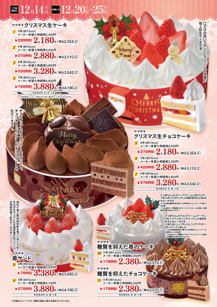 お知らせ 2025年のクリスマスケーキご予約受付を開始しました!! クリスマスケーキはご予約がお得!! ヤマザキケーキならメーカー参考価格より最大770円引き 1品につき50ポイントその場で進呈(1,500円(税抜)以上の商品に限ります) ご予約の期間は2025年12月14日(日)までとなります(一部商品は2025年12月12日(金)) ご予約は各店のサービスカウンターで受付中です。お気軽にお問い合わせください。