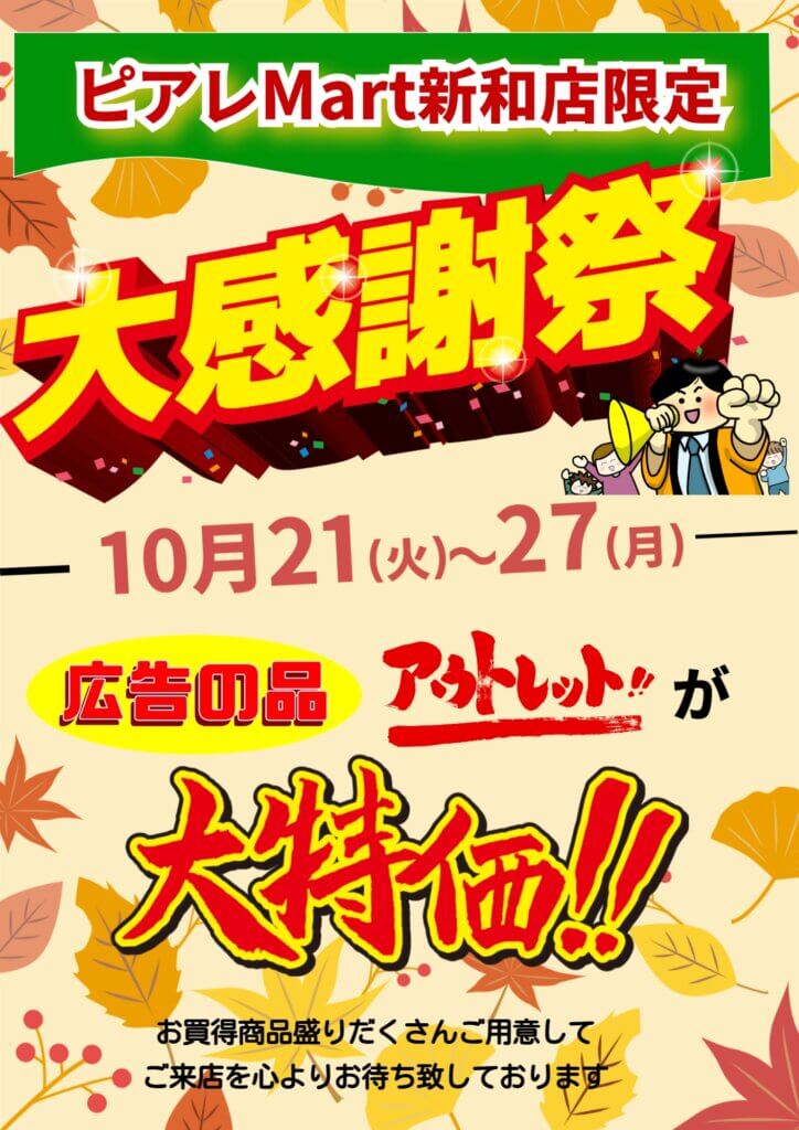 お知らせ ピアレマート新和店限定!!大感謝祭開催!! 2025年10月21日(火)~2025年10月27(月)に一部のチラシ広告の品、および、数量限定のアウトレット品を大特価でご奉仕いたします。 お買得商品を盛りだくさんご用意しております。ご来店を心よりお待ちしております。