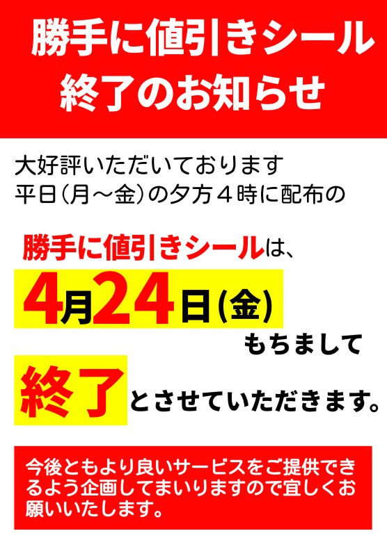 お知らせ 大好評をいただいております平日(月から金)の夕方4時に配布しております「勝手に値引きシール」は2026年4月24日(金)をもちまして終了とさせていただきます。 今後、より良いサービスをご提供できるのに企画をしてまいりますので宜しくお願い致します。