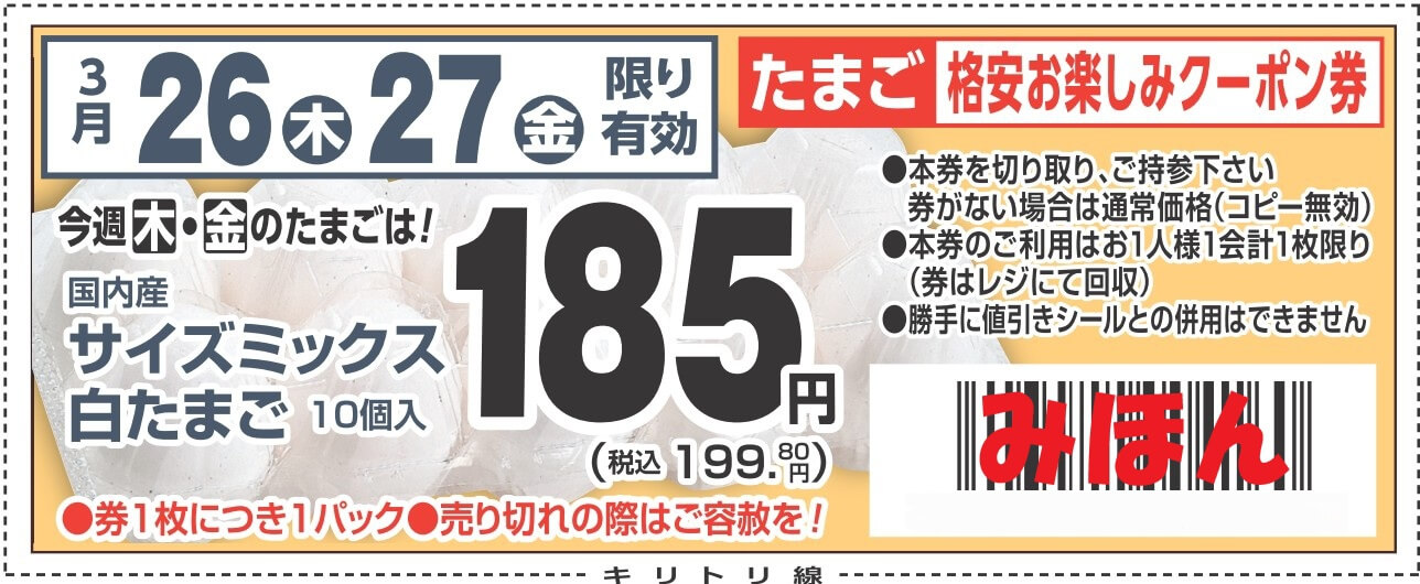 - チラシの「たまご格安お楽しみクーポン券」を切り取ってご持参頂くと木曜日・金曜日にサイズミックスたまご1パック(白玉子または赤玉子)を特売価格で購入できます!!