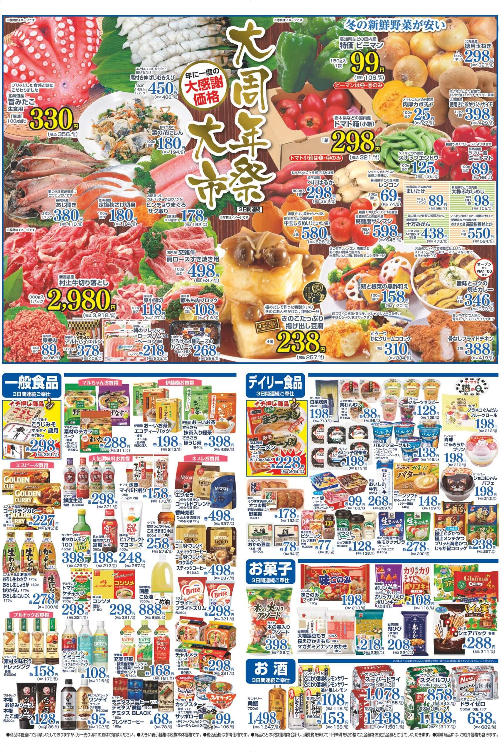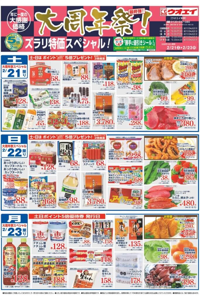 お知らせ ウオエイ店舗では日頃の感謝の気持ちを込めての大周年祭開催します!! 期間は2026年2月17日(火)~2026年2月23日(月)です。 画像は後半の2026年2月21日(土)~2026年2月23日(月)のチラシです。 盛りだくさんの内容でお待ちしております。皆様のご来場を心よりお待ちしております!